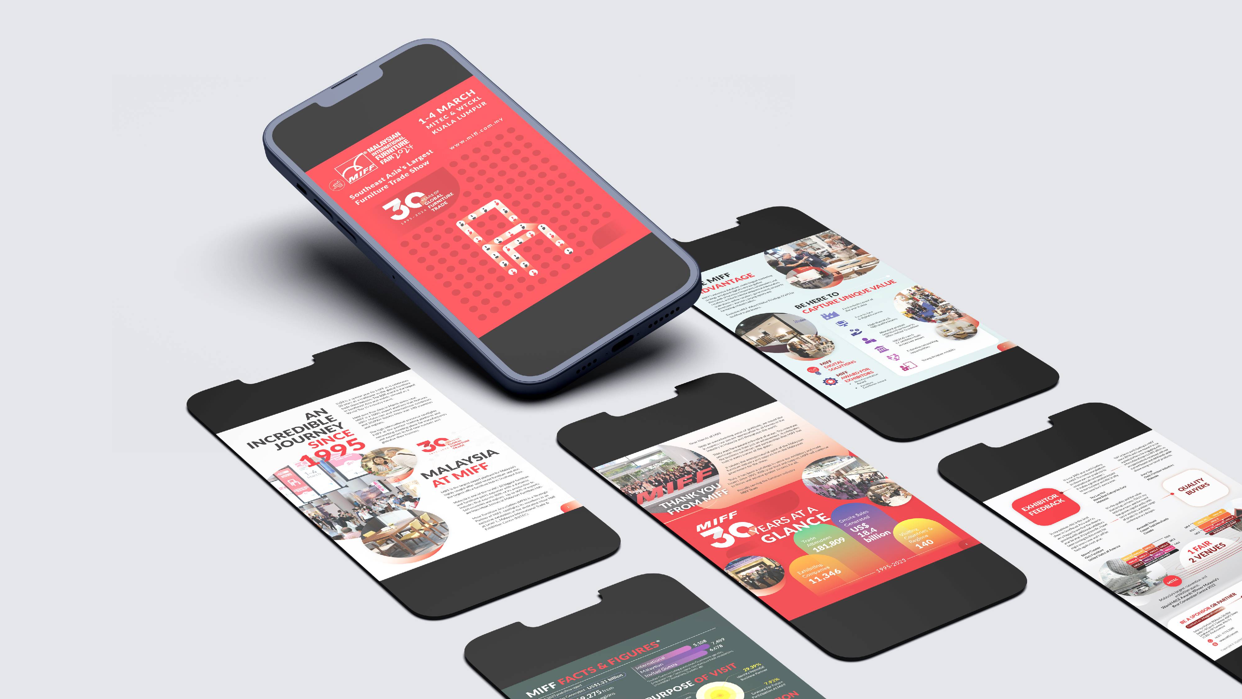 The key visual for MIFF uses small circles in grids to represent booths and exhibitors, dynamically interacting to form intricate furniture outlines. This concept highlights the diverse offerings and collaborative spirit of the furniture industry, capturing MIFF as a platform for creativity, innovation, and collaboration.